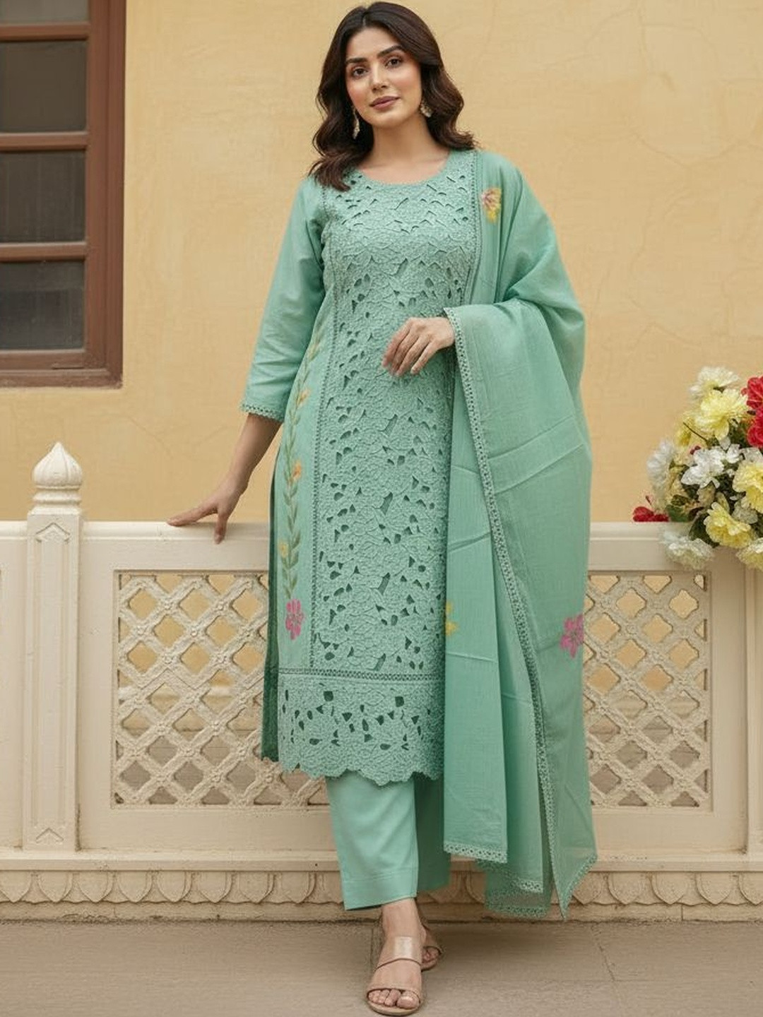 Green Yoke Design Silk Blend Straight Suit Set With Dupatta